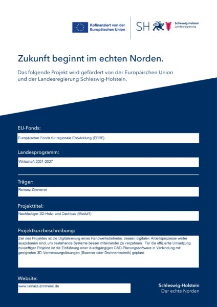 Projektbeschreibung: Ziel des Projektes ist die Digitalisierung unseres Handwerksbetriebs, dessen digitalen Arbeitsprozesse weiter auszubauen sind, um bestehende Systeme besser miteinander zu verzahnen. Für die effiziente Umsetzung zukünftiger Projekte ist die Einführung einer durchgängigen CAD-Planungssoftware in Verbindung mit geeigneten 3D-Vermessungslösungen (Scanner oder Drohnentechnik) geplant.